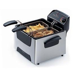 Fry two different types of food at once or extra-large batches with this professional-style dual-basket deep fryer. The units generous 12-cup food capacity allows for frying family-size quantities in a hurry while its oblong-shaped baskets nicely accommodate large pieces of chicken or fish. An adjustable thermostat allows for selecting a variety of frying temperatures and the signal light indicates when oil is ready for frying. Another highlight includes the units 1800-watt immersion element which provides quick preheating and fast oil-temperature recovery. The appliances cover acts as a spatter shield when lowering food into hot oil and its heating element and enameled pot remove easily for quick cleanup. For great restaurant taste in a convenient at-home size the deep fryer measures 16 by 15 by 11 inches and carries a one-year limited warranty. Big 12-cup food capacity for frying family-size quantities in a hurry. Oblong-shaped baskets are ideal for large pieces of chicken or fish. 1800-watt immersion element provides quick preheating and fast oil temperature recovery. Adjustable thermostat for easy selection of a variety of frying temperatures. Signal light lets you know when the oil is ready for frying. Heating element and enameled pot are removable for easy cleaning. 120 Volts AC 1800 Watts.headerThis Professional-style deep fryer with dual baskets. offers great restaurant taste in a convenient at-home size. Fries two foods at once or extra large batches.header10/01/2009header1 Year Limited Warranty